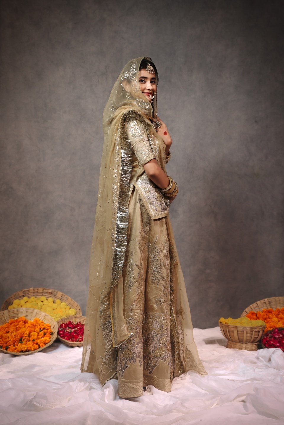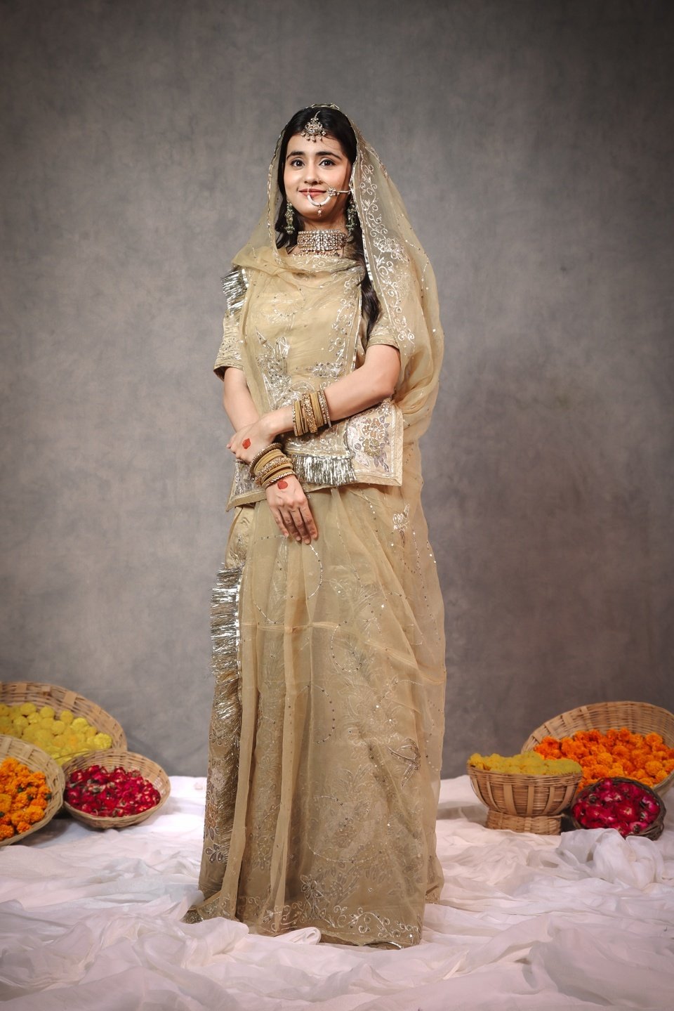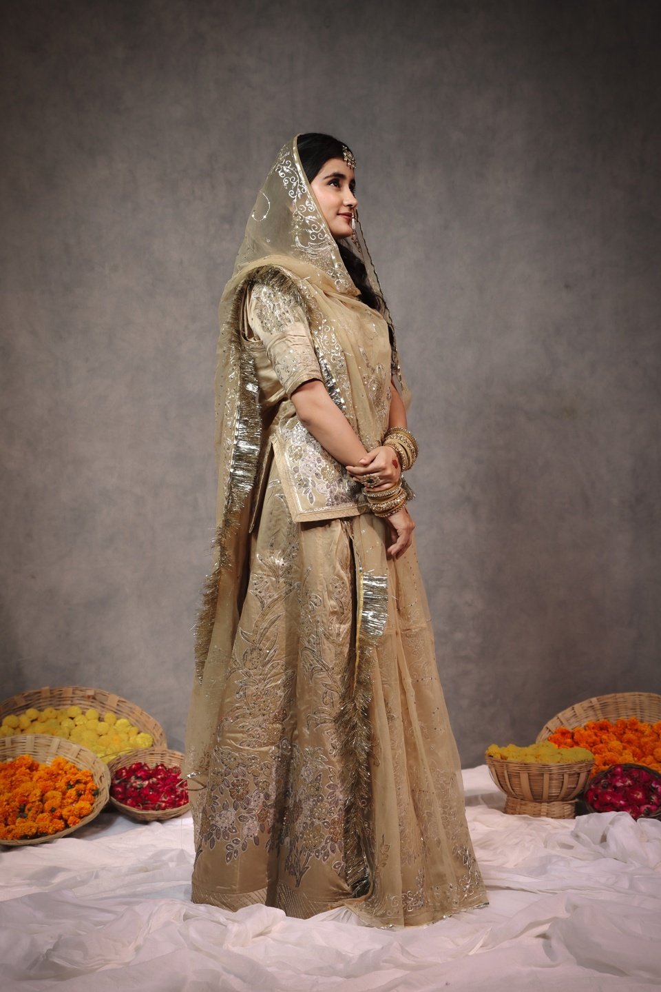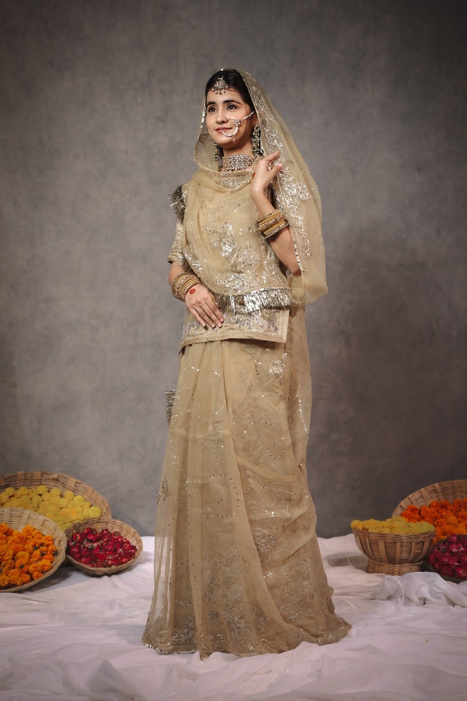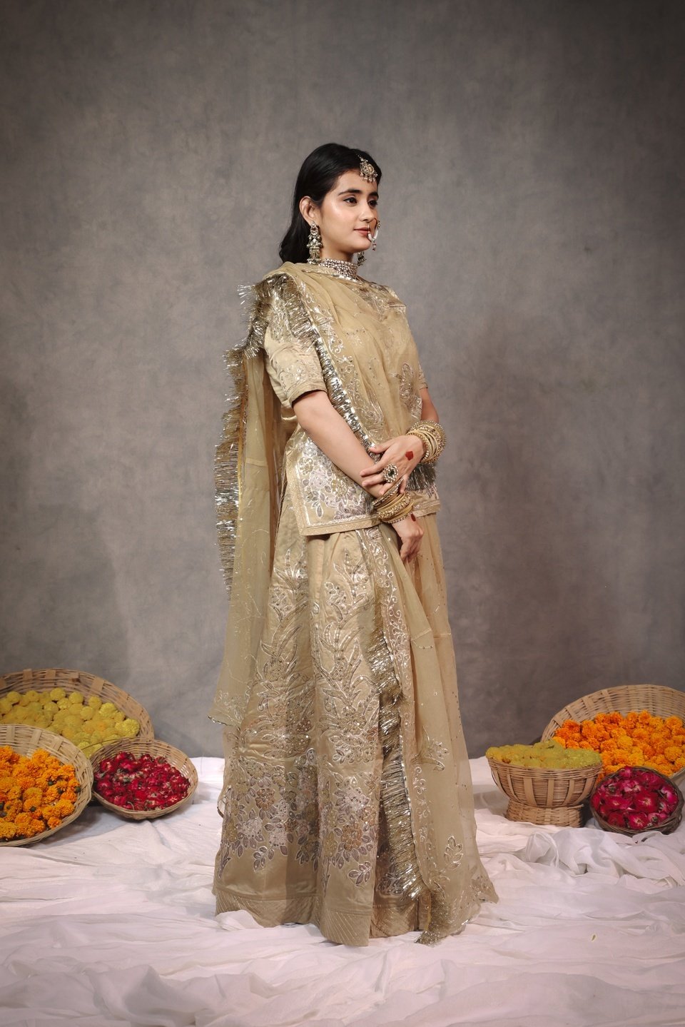 Indulge in pure luxury with this masterpiece Member Saatan Rajputi Poshak. Crafted for the elite, this ensemble features exquisite Heavy Tracing Work (Treshing) done with precision and intricate detail. The soothing Beige-Gold color combined with the rich sheen of Member Saatan fabric creates a look of understated royalty. A true heirloom piece, this poshak is perfect for brides and close family weddings.
